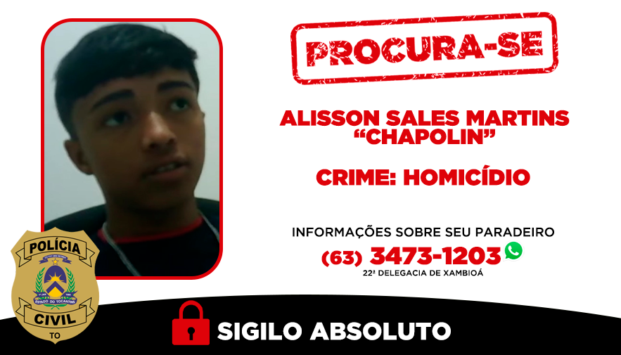 Quem souber do paradeiro de Alisson Sales Martins, o “Chapolin”, pode acionar a Polícia Civil pelo telefone/WhatsApp (63) 3473-1203 – DICOM SSP-TO file_download