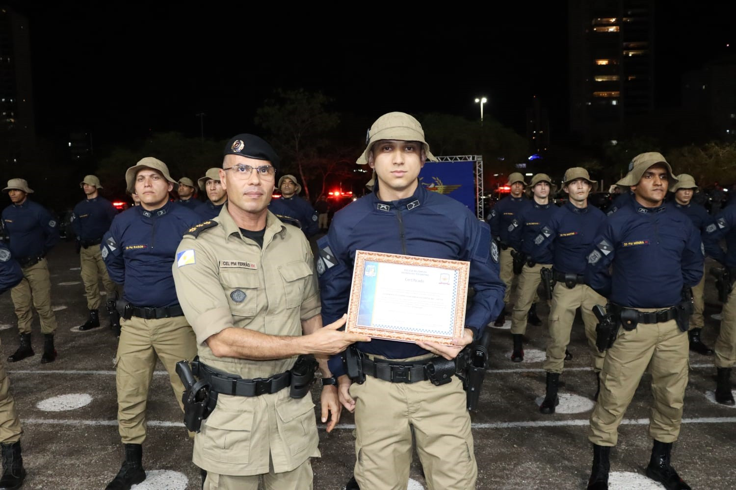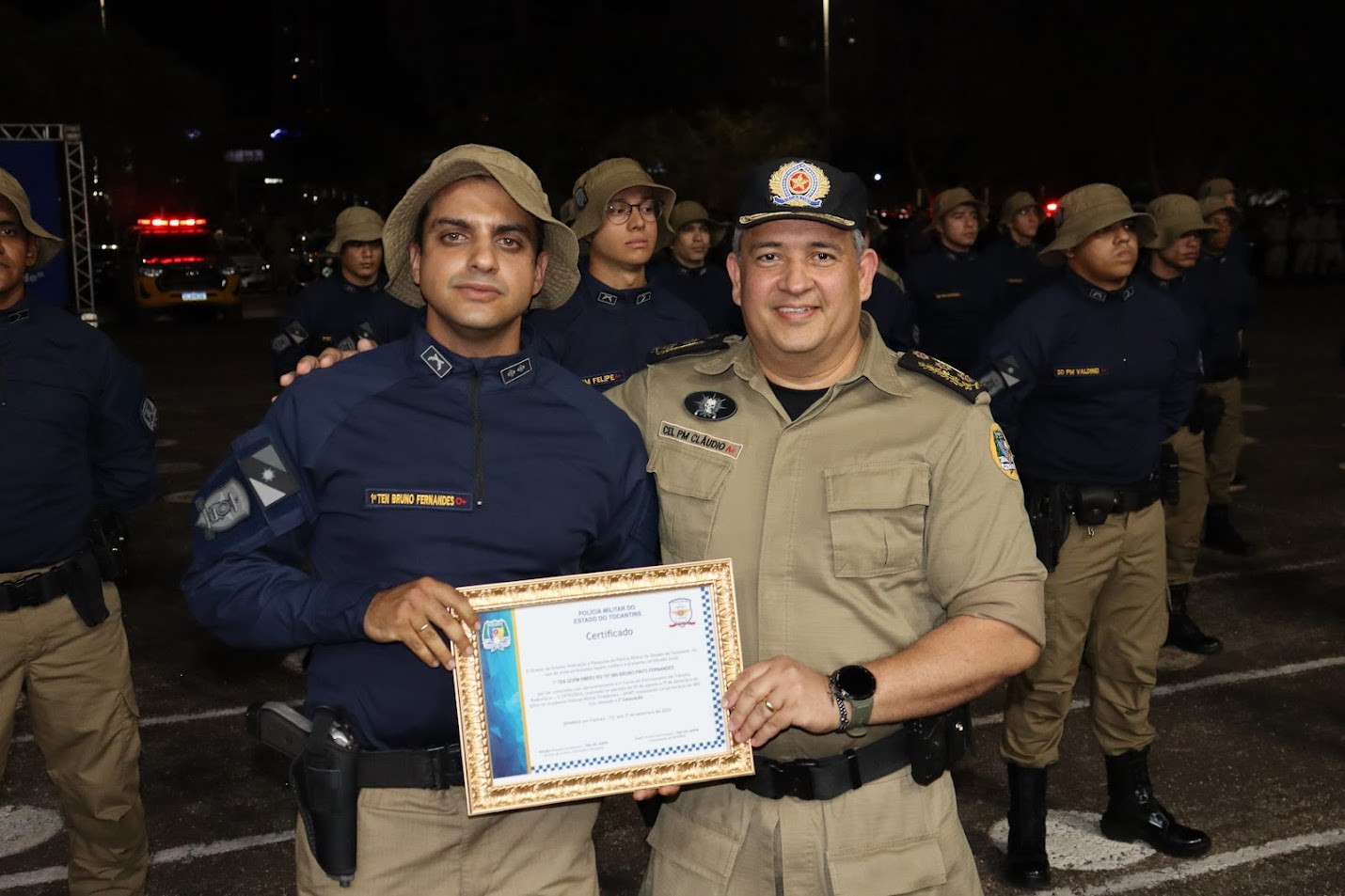 Coronel PM Cláudio entregou homenagem ao primeiro colocado no curso, o tenente Fernandes, da PM do Rio de Janeiro – Felipe Cruz/Governo do Tocantins file_download